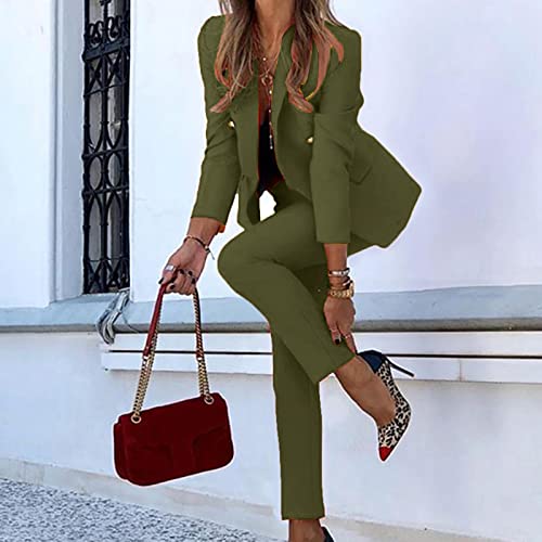 Women's Two Piece Set Double Breasted Open Front Long Sleeve Blazer and Elastic Waist Solid Pant Outwear Casual Suit (Army Green-8#, XXL)