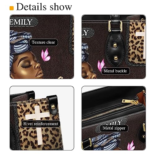Fabric type: Black leatherOrigin: ImportedClosure type: ZipperLining: Polyester👜 INSPIRATIONAL GIFTS FOR WOMEN: The Black Woman Shoulder Bag is a stylish accessory designed specifically for women. Made from high-quality black leather, this bag exudes elegance and sophistication. It features ample space to carry all your essentials, making it practical for daily use or special occasions. The sleek design and sturdy construction make it a reliable companion that complements any outfit.🎁 PERFECT GIFTS FOR LADIES ON ANY OCCASION: Bless your loved ones by gifting this African American Girl bag on holidays or special occasions such as Christmas, Mother's Day, Father's Day, Easter, Thanksgiving, Birthdays, and Wedding Days, or any milestone when she achieves significant accomplishments in her life.👗 FASHIONABLE AND UNIQUE ITEM: Each Personalized Black Woman Bag features beautifully printed names, allowing you to add a personal touch. You can mix and match this handbag with most clothes to create a stylish outfit that completes your fashion look and makes you stand out wherever you are.💼 HIGH-QUALITY DURABLE MATERIAL: Printed double-sided with premium quality imitation leather (made and finished to resemble genuine leather), this bag is resistant to peeling, unfading, and environmentally friendly. It’s easy to clean and withstands daily wear and tear.🌍 PERFECT FOR EVERYDAY TRAVEL: Our African American Girl Bag strikes the perfect balance between function and style. The leather bag with rolled leather top carrying handles and a removable adjustable shoulder strap can go from workday to weekend, making it a great item for travel or any outing without missing a beat. Perfect for everyday use. superior materials and excellent craftsmanship ensure long-lasting durability.